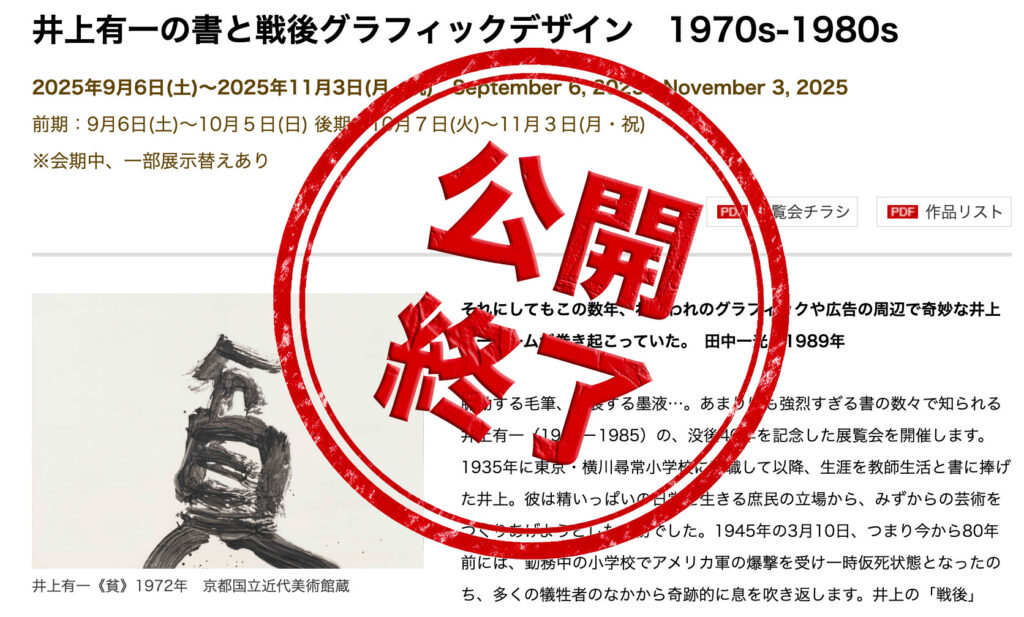 10月7日〜11月3日 井上有一の書と戦後グラフィックデザイン 1970s-1980s 投稿日: 2025年10月4日2025年12月31日 投稿者: abank 井上有一の書と戦後グラフィックデザイン 1970s-1980s が渋谷区立松濤美術館で展示されています。2025年9月6日(土)~2025年11月3日(月・祝) September 6, 2025-November 3, 2025前期:9月6日(土)~10月5日(日) 後期:10月7日(火)~11月3日(月・祝)公式サイトはこちら↓松濤美術館公式サイト
